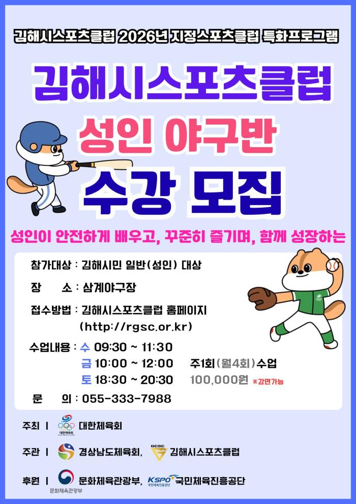 안녕하십니까? 김해시스포츠클럽에서 김해시민 (성인)을 대상으로 야구 수강생을 모집하고 있습니다. 감면도 가능하다고 하니 관심있는 동호인분들은 아래의 연락처로 문의 하시면 됩니다.